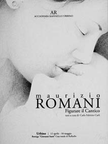 Per Maurizio Romani da sempre - si legge nel catalogo a cura di Carlo Fabrizio Carli - <<arte e sacro sono aspetti inscindibili della comunicazione pittorica>>. Nell’occasione il sacro è Il Cantico dei Cantici affrontato - nei contorni delle figure, nei loro trasporti amorosi, nei balzi del corpo sopra la terrestrità - con il rilievo della grafite che segna senza marcare. Tutta di oggi, ma trasposta su un piano ideale, l’inclinazione, riguardo ai protagonisti, alla sensibilità, al tratto dello sguardo posato, peraltro, su “modelli” quotidiani filtrati e rintracciati nell’immaginario e nella pubblicistica odierna. (E del bagaglio dell’autore: una foto del suo matrimonio e, per alcune figure, una delle sue figlie). Quasi a volere dare al sacro un valore che possa comprendere il “profano” e, viceversa, al profano giornaliero la possibilità di non perdersi nelle strettoie e nella perentorietà. L’ Amato e l’Amata della tradizione salomonica sono, così, visti e colti nelle vesti e nei portamenti, nelle movenze, dentro un presente dall’essenza ariosa. Nel silenzio che accoglie la sensualità, si incontrano il sogno e il desiderio, le tenerezze e l’affetto, mentre l’erotismo che incontra quel silenzio diviene profondo e interiore e, per ciò stesso, pudico o discreto ma non meno intenso. Nei tratti di una matita che sottrae peso ai corpi, ai visi riempiendo di grigio il vuoto che li contorna, la vicenda dei due sposi o fratelli o innamorati si avvolge in una liricità che appartiene sia alla versione del Cantico di Cesare Angelini (Einaudi, 1973), sia a quella più recente (Book, 1999) di Agostino Venanzio Reali, sacerdote il primo, francescano il secondo. Due esempi di traduzione e solo del versante religioso, ché la figurazione del Cantico di Maurizio Romani assume la trasparenza di un amore contenuto nel dare e nel ricevere e la trasparenza dello sguardo gettato attraverso la materia per l’oltre che ne esce, come mostrano, anche, le nature morte colorate della seconda parte della esposizione. Maria Lenti