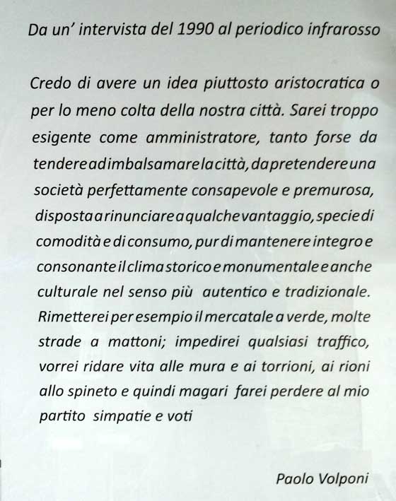 La mostra dedicata al grande scrittore urbinate Paolo Volponi č stata arricchita con brani tratti dalle opere di questi conteneti descrizioni della cittā |