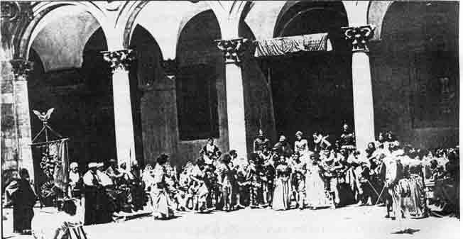 Il corteo è ormai giunto al termine del suo lungo viaggio e sta per varcare la soglia della reggia del Laurana dove il duca Federico da Montefeltro è in attesa di rendere omaggio alla sua giovane sposa prima che essa si insedi definitivamente nel palazzo quale duchessa di Urbino. Nella foto in alto vediamo infatti uno stuolo di nobili cortigiani, dame di compagnia paggi e soldati che fanno da corona alla ricca portantina dove, dignitosamente come si conviene ad una Sforza, siede la tredicenne promessa sposa mentre, la foto in basso mostra il grande Federico, attorniato dai più importanti dignitari della corte, prossimo ormai: ad impalmare, lui ormai quarantenne ed alle sue seconde nozze, la virtuosa, amabile e colta (così scriveranno di lei i biografi), anche se non bella nipote del potente duca di Milano.